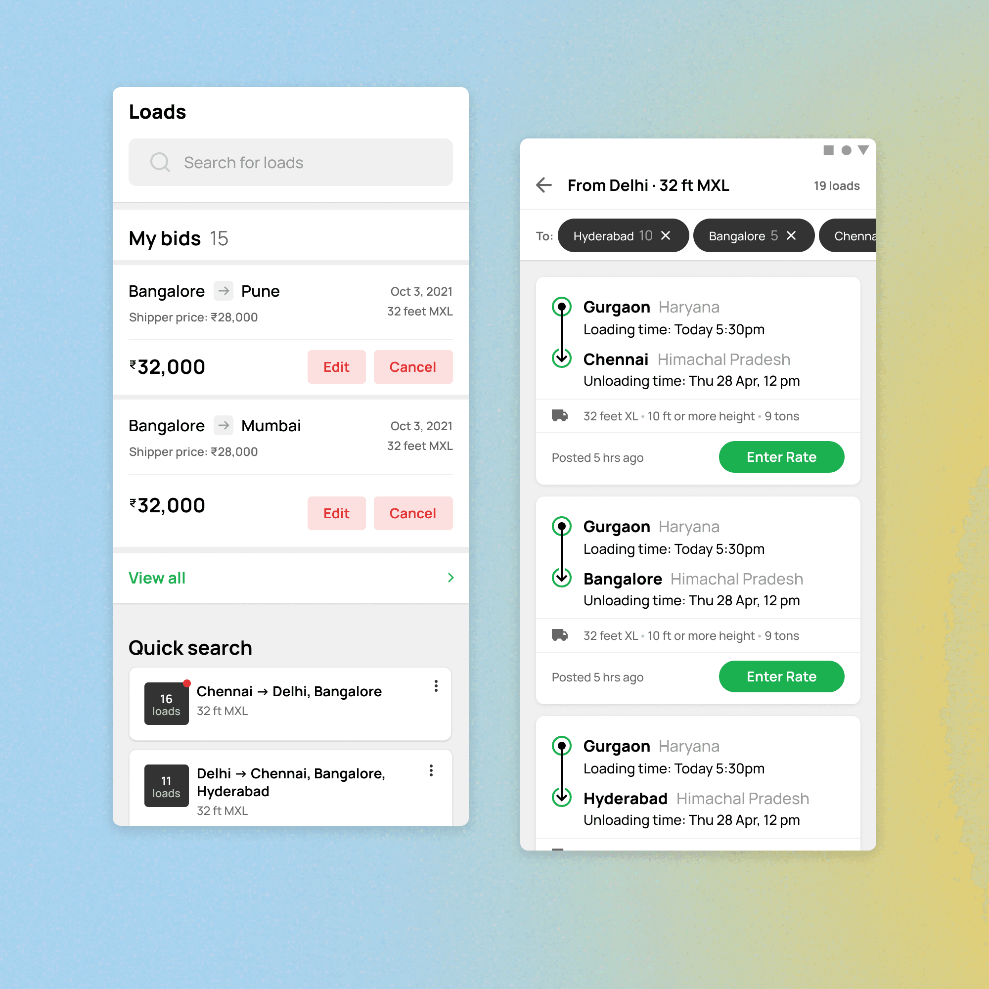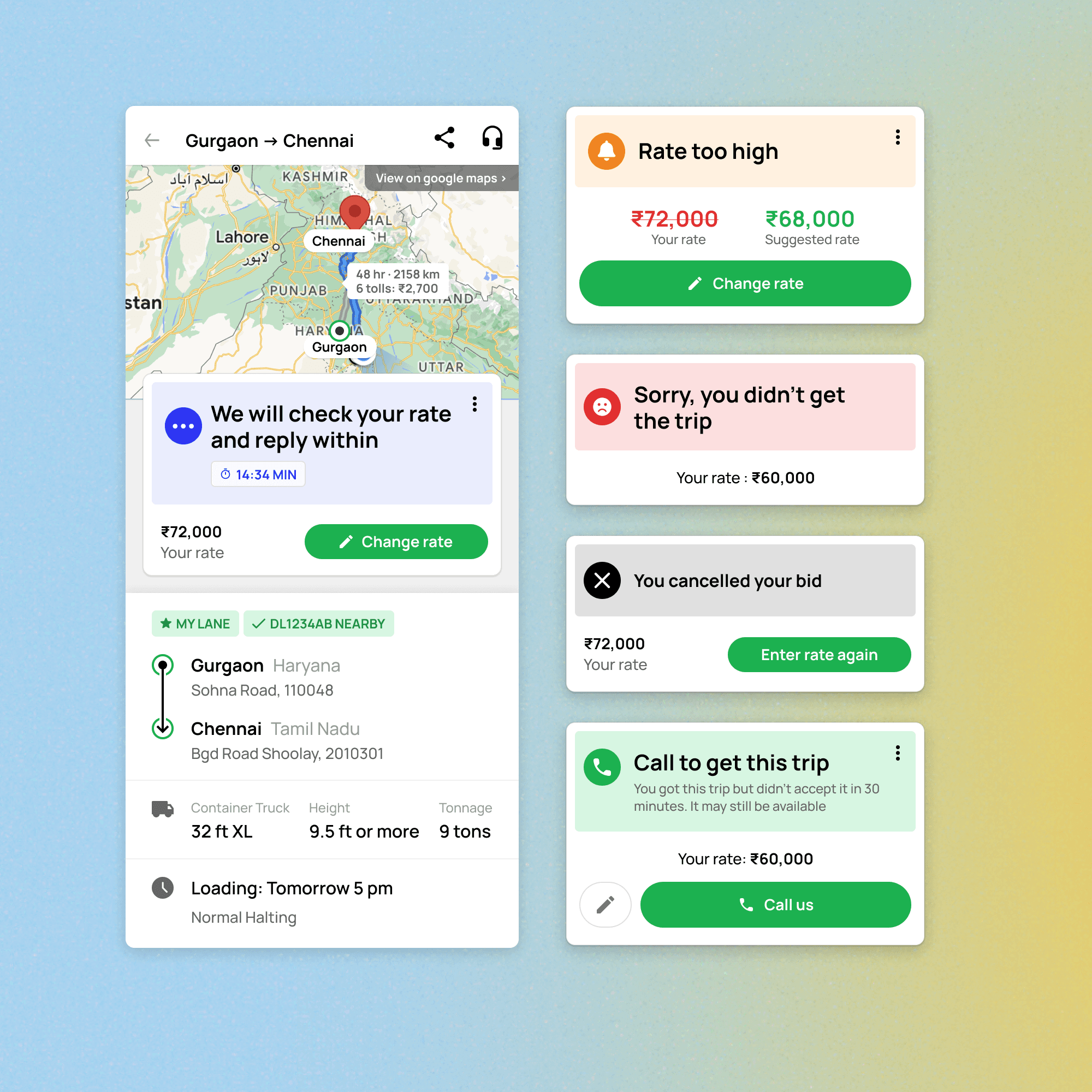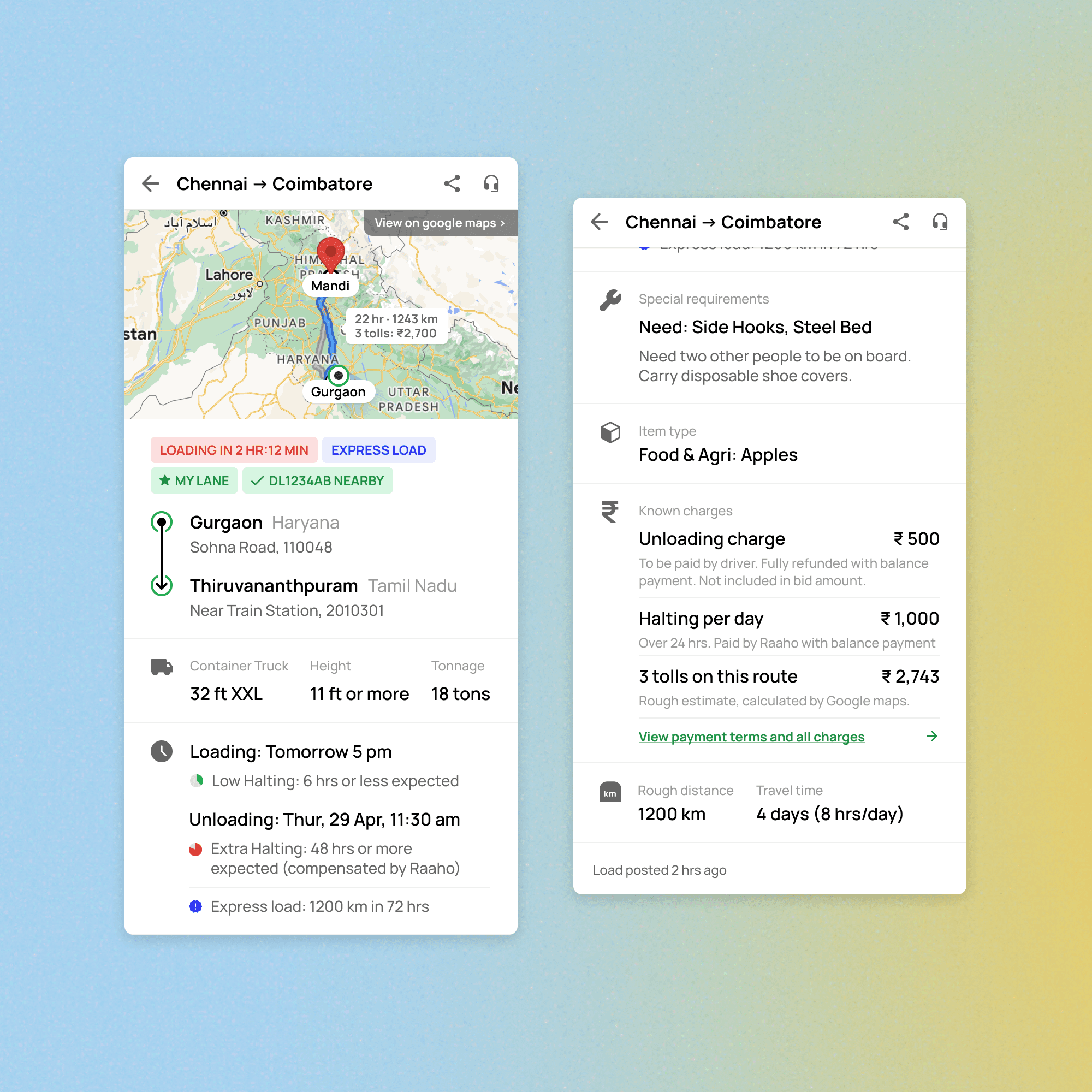 I worked as the product designer, collaborating with Juhi Chitra and the co-founder/Head of Product. My work spanned end-to-end –– from on-ground field research and experience definition to crafting the final visual design and validating it through iterative testing with shippers and truckers.