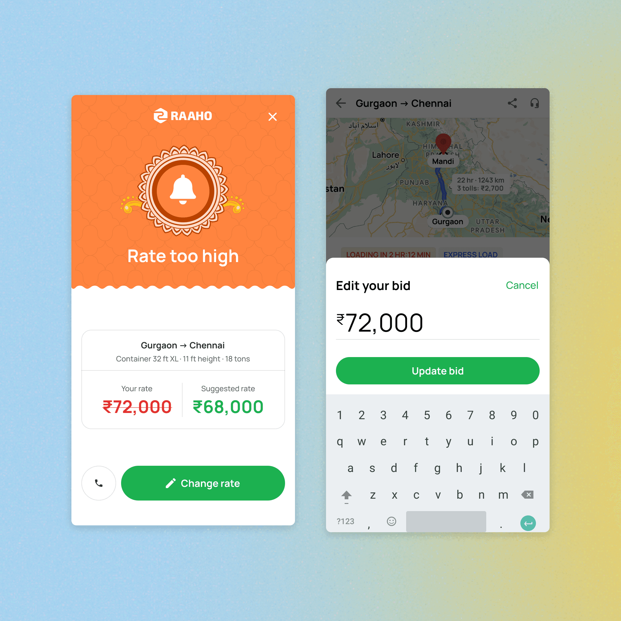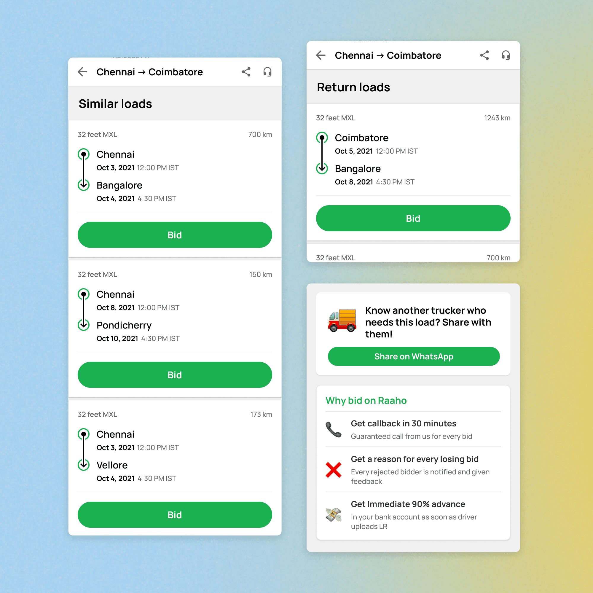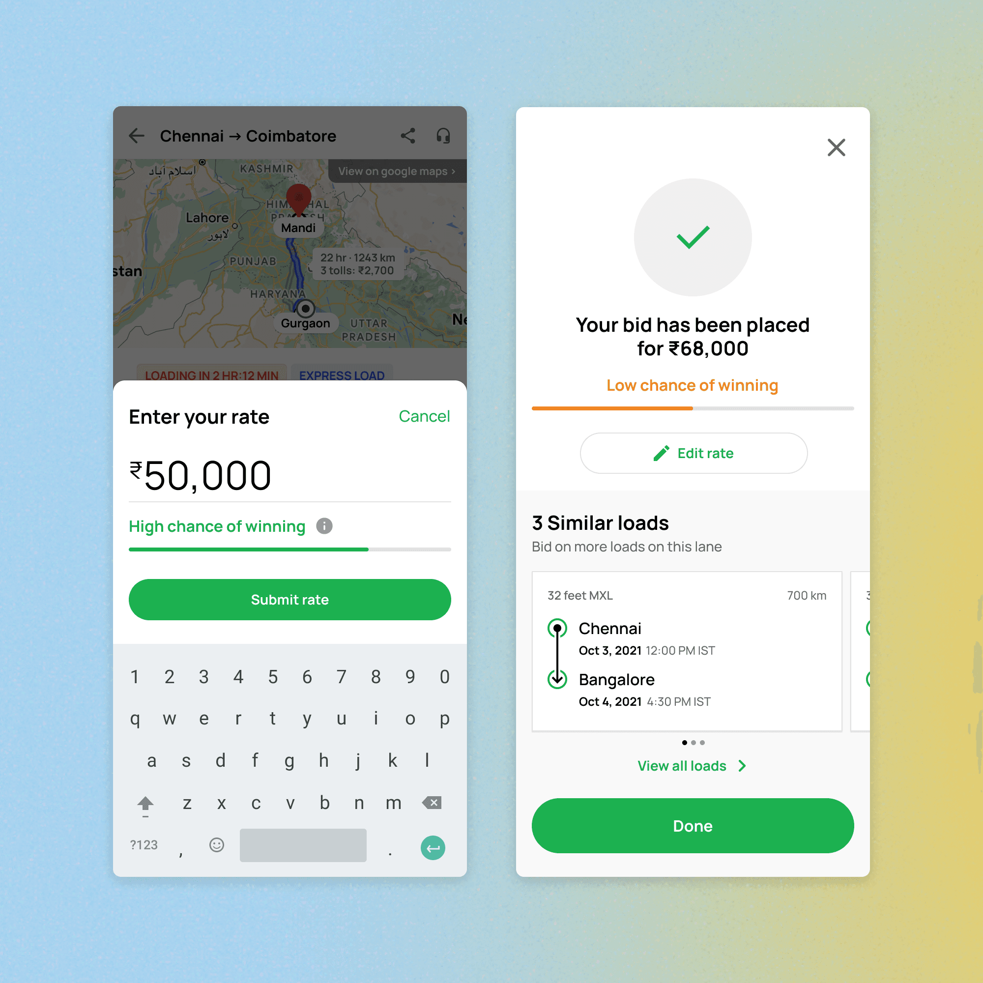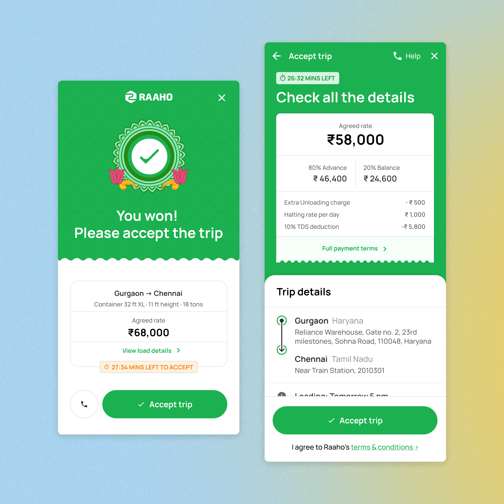 I worked as the product designer, collaborating with Juhi Chitra and the co-founder/Head of Product. My work spanned end-to-end –– from on-ground field research and experience definition to crafting the final visual design and validating it through iterative testing with shippers and truckers.